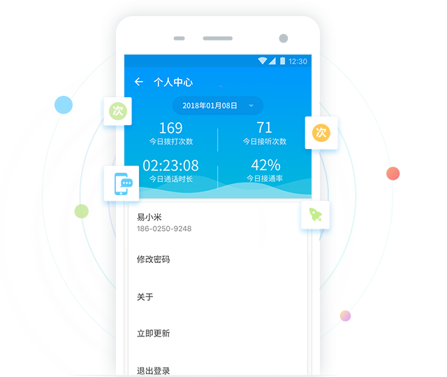 手机客户端对销售外呼次数、接通次数、通话时长、接听率进行统计,并可筛选查询不同日期的呼叫情况。